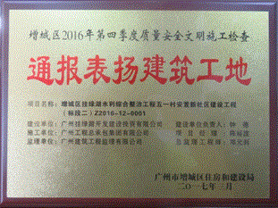 在日前增城区 2016 年度第四季度质量安全文明施工检查评比中,获得了增城区住建局的通报表扬及授予奖牌,并在省双优第一次专家评审中,项目的安全文明、标准化与绿色施工等建设工作均被给予了充分肯定与高度评价。